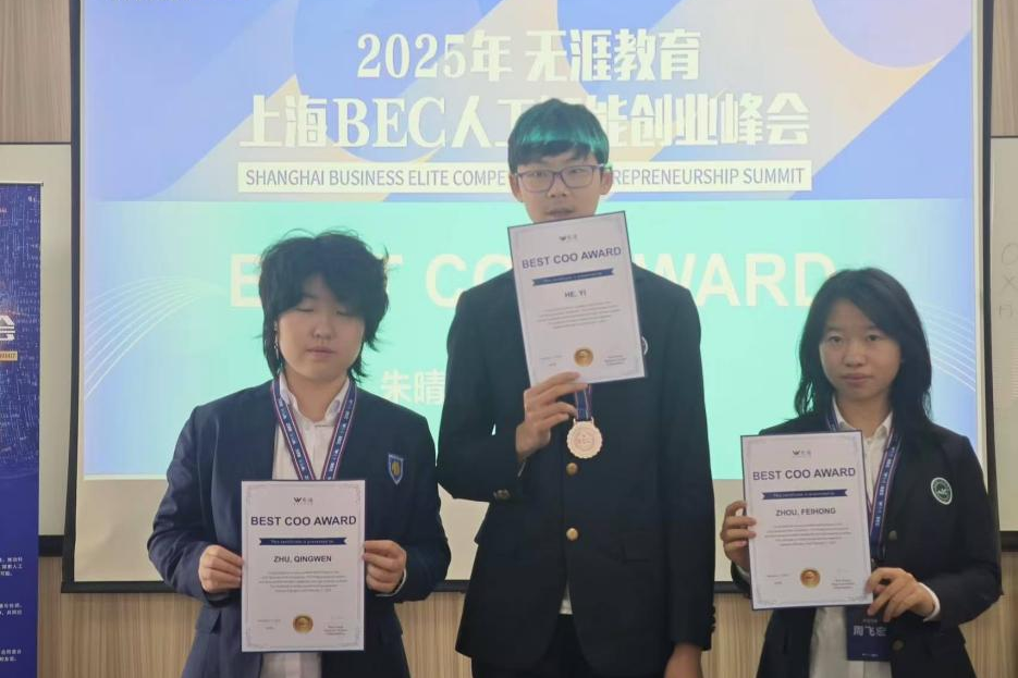 值得一提的是,我校由Mark(CEO)、Hermione、Lily、Max、Austin、Jerry、Yolanda组成的团队在本次峰会中脱颖而出,荣获冠军。
