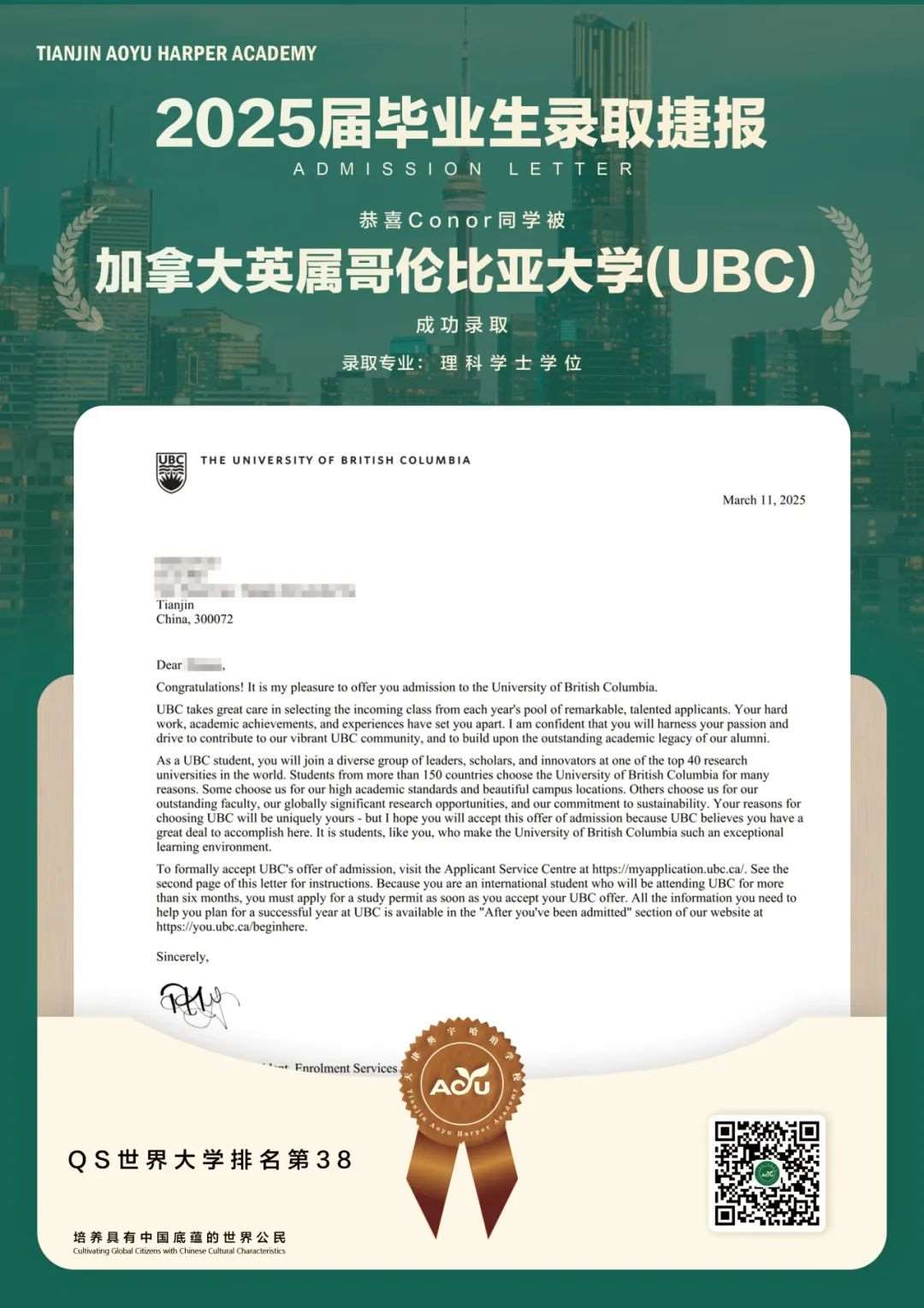 【重磅喜讯】天津奥宇哈珀学子斩获加拿大UBC大学录取!