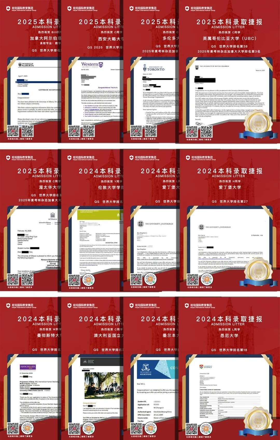 截止至2024年,哈珀国际教育集团全国四大校区2024届121名毕业生获得了来自英国、澳洲、加拿大、中国香港、新加坡等国家和地区871封大学录取通知书。人均7.2封来自世界各地学校的录取通知书,在大学录取QS排名上,更达到了惊人100%全球前100大学录取*!