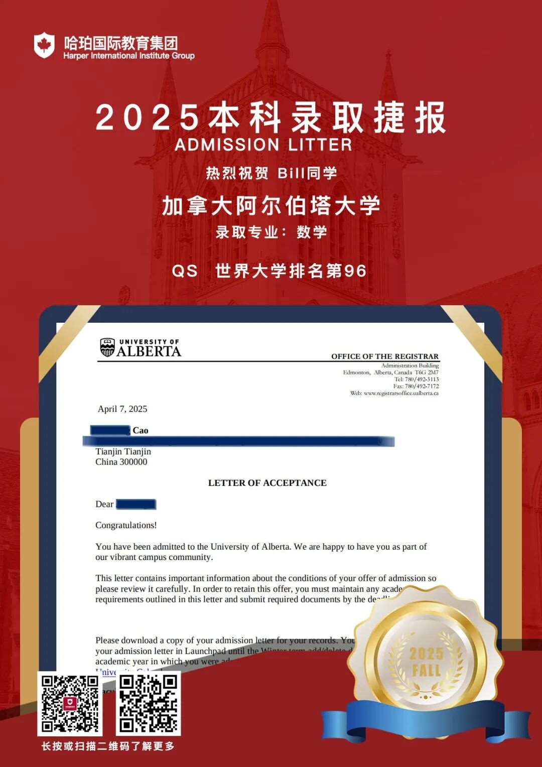 热烈祝贺Bill同学在短短两日内连续收获两所加拿大学校录取!继昨日收到西安大略大学(Western University)的录取后,今日再添一枚2025全球QS 96名、加拿大TOP 5研究型大学——阿尔伯塔大学(University of Alberta)的Offer!