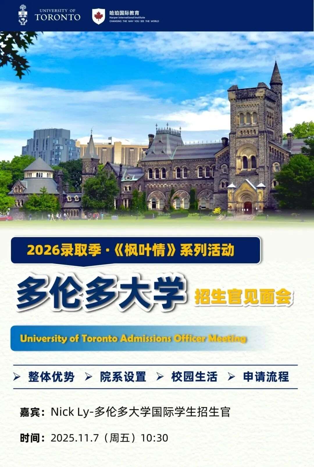 在此次宣讲会中,我校荣幸邀请到多大资深招生官Nick老师亲临现场。凭借多年的招生录取经验,他将全面剖析多伦多大学的学术科研实力、特色专业设置、多元化校园氛围以及完善的国际学生支持服务等关键方面,助力学生与家长深入了解这所世界级学校。
