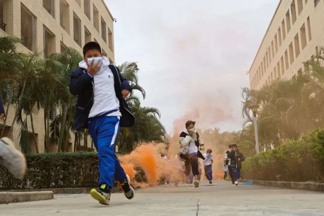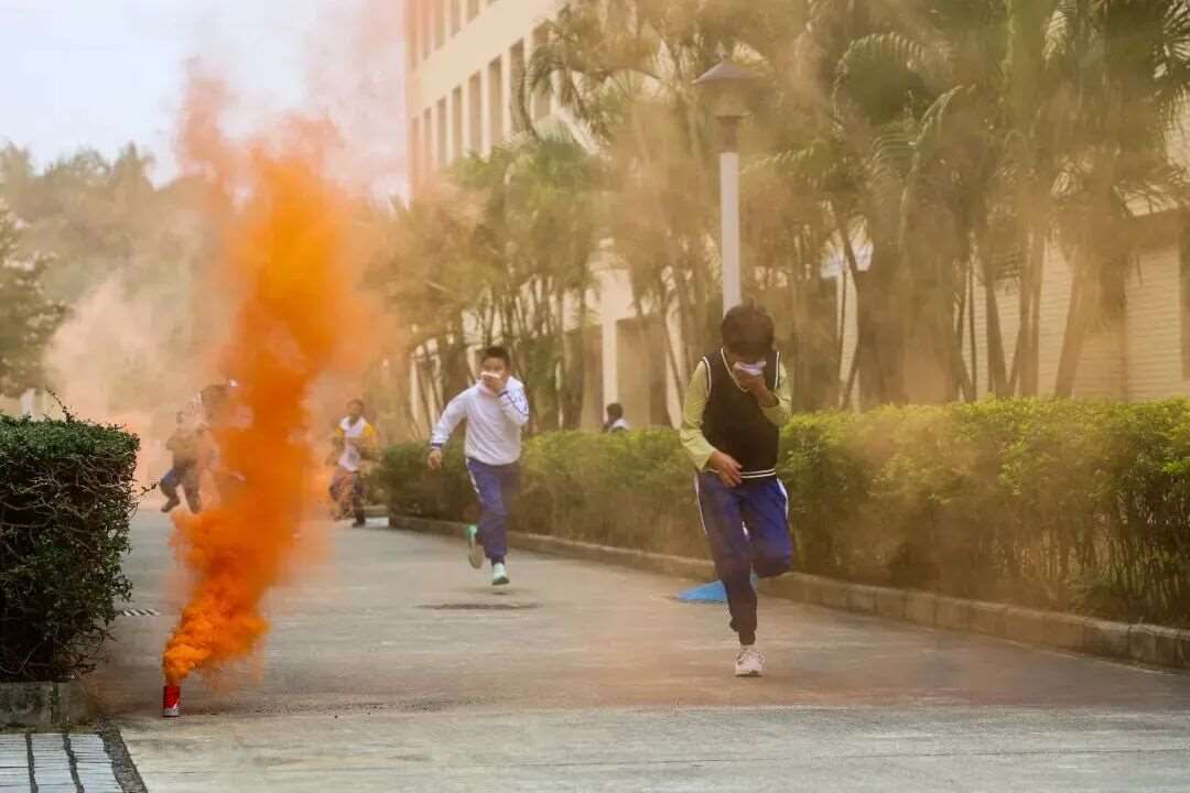 顷刻间,模拟火灾烟雾的橙色浓烟自楼体周边升腾弥漫,有效营造出逼真的“火场”氛围,使师生们对火灾的紧迫性有了更直观的感受,深刻认识到掌握正确逃生技能的必要性。
