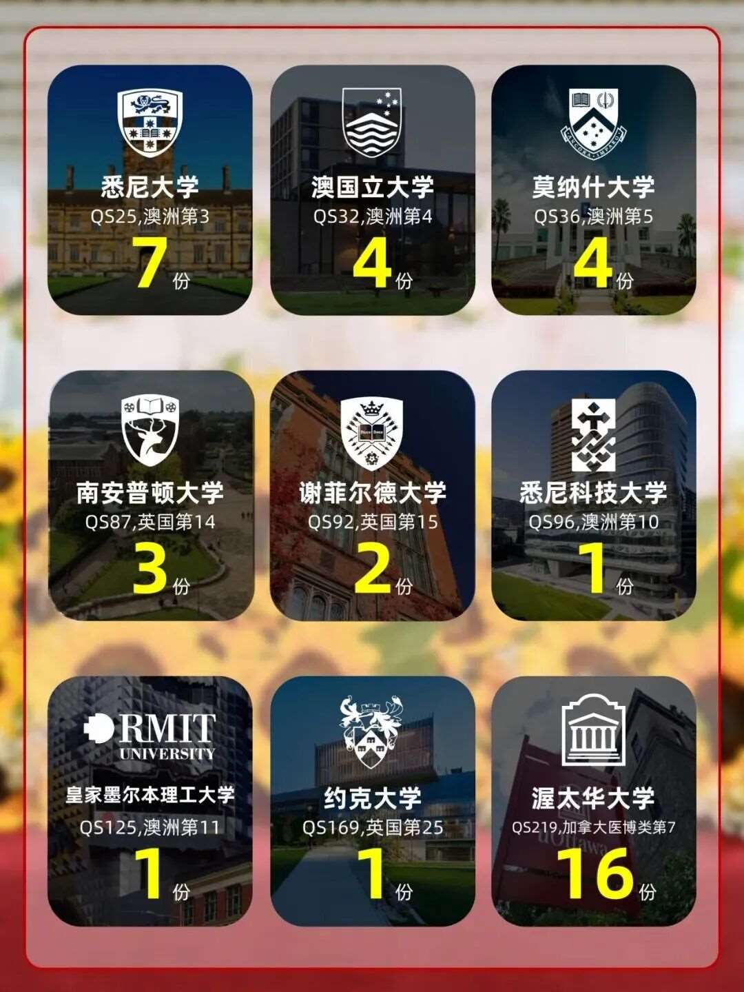 2026届录取季自今年9月启动以来,集团旗下学子展现出强劲的全球竞争力。自9月20日起,陆续收获了包括QS世界大学排名第25位的悉尼大学、第36位的莫纳什大学在内的多所高校录取通知,为本届录取季拉开了精彩序幕。