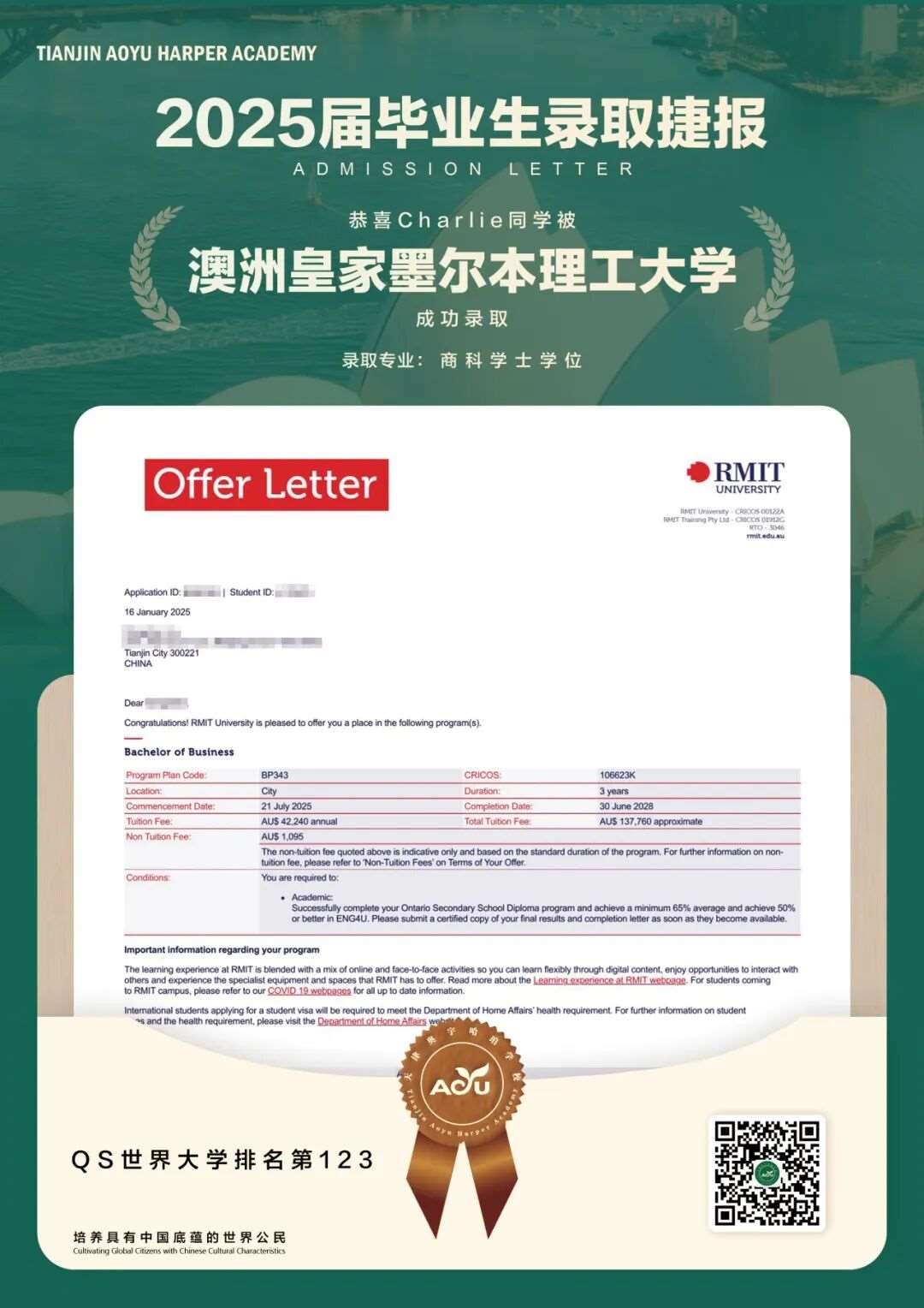 努力、清醒的回报是一张梦想的offer,一切如Charlie所愿,他非常高兴。在国际高中的这一年他学到了不一样的知识,收获了很多朋友,学会了独立自主,实现了当初的理想。