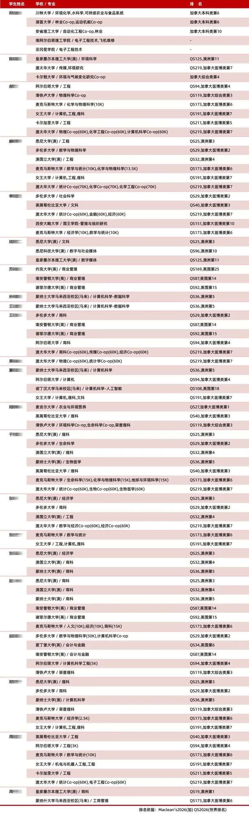 - 加拿大:以医博类和综合类大学为主,多伦多大学(QS29)、英属哥伦比亚大学(QS40)、麦吉尔大学(QS27)、阿尔伯塔大学(QS94)、滑铁卢大学(QS119)、西安大略大学(QS151)、麦克马斯特大学(QS173)、女王大学(QS191)、渥太华大学(QS219)等医博类及综合类学校均有批量录取。
